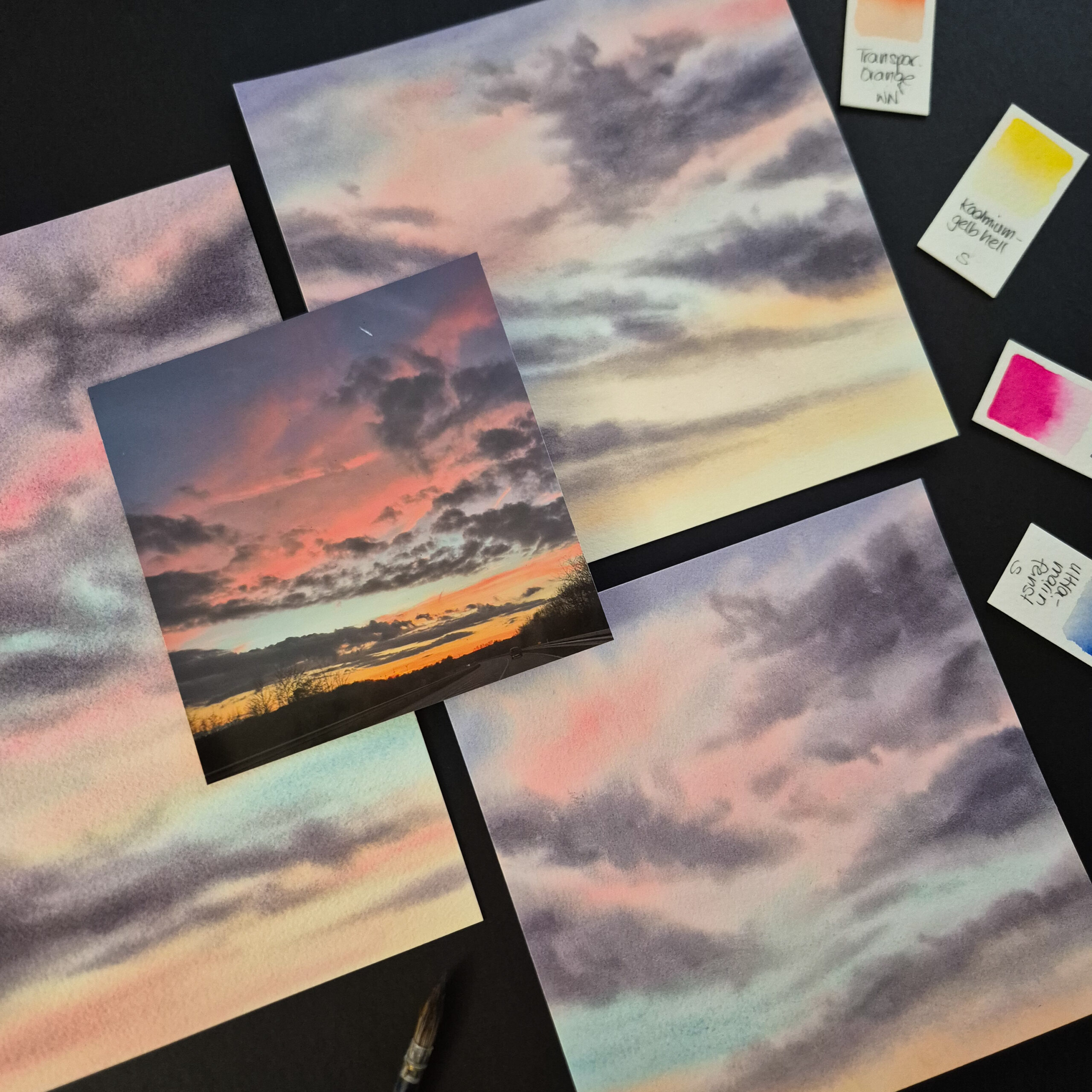 Die Idee entstand zum einen aus dem Wunsch heraus, Himmel von Fotos oder aus dem Alltag als Inspiration zu nehmen und zu malen. Zum anderen wollte ich unbedingt die Technik beherrschen, solche Himmel mit sanften Farbverläufen und fluffigen Wolken malen zu können. Und dann das ganze möglichst locker und schnell und nicht mit tausend Details und stundenlangem Ausmalen. Mit dieser Kombination war ich aber heillos überfordert. Echte Himmel halten sich leider nicht daran, möglichst große, gut abgrenzbare Flächen zu haben, die man easy abmalen kann. Nein, da ist meist ein großes Komglomerat an Farben und Wolken am Himmel, so dass man keinen Plan hat, wie man anfangen und von diesen ganzen tausend Details wegkommen soll. Und dazu kommt dann das Problem, wie man das alles malt. Nass in nass? Nass auf trocken? Beides? Ganz was anderes? Und wie schafft man das alles, bis das Papier trocken ist und am Ende nicht alles komplett ineinander gelaufen ist…??? Man merkt, ich war völlig verzweifelt. Und selbst als ich das dann irgendwie hingekriegt hatte, war ich mit den Farben nicht zufrieden. Entweder war alles zu blass oder es wirkte zu plakativ und „bunt“. Bis ich verstanden habe, welche Farben ich nehmen kann und vor allem, wie ich sie mischen kann, um harmonische Kombinationen zu erhalten.